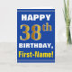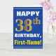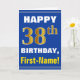 Denna enkla födelsedag-themed hälsningkortdesign presenterar en varm födelsedagwishnågot liknande "den 38th FÖDELSEDAGEN för LYCKLIG, förnamn!", på bekläda i djärv text på en blått färgade bakgrund. Födelsedagen numrerar har faux-/efterföljdguld-något liknande färga som är utseendemässigt. Namn på bekläda kan skräddarsy. Insidan presenterar ett födelsedagmeddelande som kan vara personligen. En något liknande för hälsningkort detta kunde vara en roligt långt som levererar födelsedagönskemål till någon som firar deras födelsedag för åttondel trettio. [~Z0000278]