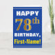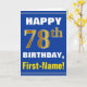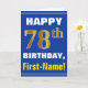 Denna enkla födelsedag-themed hälsningkortdesign presenterar en varm födelsedagwishnågot liknande "den 78th FÖDELSEDAGEN för LYCKLIG, förnamn!", på bekläda i djärv text på en blått färgade bakgrund. Födelsedagen numrerar har faux-/efterföljdguld-något liknande färga som är utseendemässigt. Namn på bekläda kan skräddarsy. Insidan presenterar ett anpassadefödelsedagmeddelande. En något liknande för hälsningkort detta kunde vara en roligt långt som levererar födelsedagönskemål till någon som firar deras sjuttioåttondelfödelsedag. [~Z0000278]