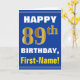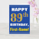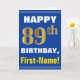 Denna enkla födelsedag-themed hälsningkortdesign presenterar en varm födelsedagwishnågot liknande "den 89th FÖDELSEDAGEN för LYCKLIG, förnamn!", på bekläda i djärv text på en blått färgade bakgrund. Födelsedagen numrerar har faux-/efterföljdguld-något liknande färga som är utseendemässigt. Namn på bekläda kan vara personligen. Insidan presenterar ett födelsedagmeddelande som kan vara personligen. En något liknande för hälsningkort detta kunde vara en roligt långt som levererar födelsedagönskemål till någon som firar deras nionde födelsedag för åttio. [~Z0000278]