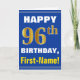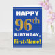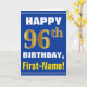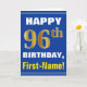 Denna enkla födelsedag-themed hälsningkortdesign presenterar en varm födelsedagwishnågot liknande "den 96th FÖDELSEDAGEN för LYCKLIG, förnamn!", på bekläda i djärv text på en blått färgade bakgrund. Födelsedagen numrerar har faux-/efterföljdguld-något liknande färga som är utseendemässigt. Namn på bekläda kan vara personligen. Insidan presenterar ett födelsedagmeddelande som kan vara personligen. En något liknande för hälsningkort detta kunde vara en roligt långt som levererar födelsedagönskemål till någon som firar deras sjätte födelsedag för nittio. [~Z0000278]