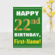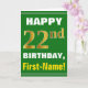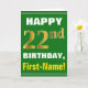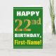 Denna enkla födelsedag-themed hälsningkortdesign presenterar en varm födelsedagwishnågot liknande "den 22nd FÖDELSEDAGEN för LYCKLIG, förnamn!", på bekläda i djärv text på en grön kulör bakgrund. Födelsedagen numrerar har en look för faux-/efterföljdguld-något liknande färgläggning. Namn på bekläda kan skräddarsy. Insidan presenterar ett födelsedagmeddelande som kan vara personligen. En något liknande för hälsningkort detta kunde vara en roligt långt som ger födelsedagönskemål till någon som firar deras tjugo understöder födelsedag. [~Z0000279]