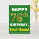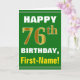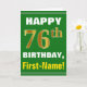 Denna enkla födelsedag-themed hälsningkortdesign presenterar en varm födelsedagwishnågot liknande "den 76th FÖDELSEDAGEN för LYCKLIG, förnamn!", på bekläda i djärv text på en grön kulör bakgrund. Födelsedagen numrerar har faux-/efterföljdguld-något liknande färga som är utseendemässigt. Namn på bekläda kan skräddarsy. Insidan presenterar ett födelsedagmeddelande som kan vara personligen. En något liknande för hälsningkort detta kunde vara en roligt långt som levererar födelsedagönskemål till någon som firar deras sjätte födelsedag för sjuttio. [~Z0000279]