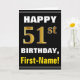 Denna enkla födelsedag-themed hälsningkortdesign presenterar en varm födelsedagwishnågot liknande "den 51st FÖDELSEDAGEN för LYCKLIG, förnamn!", på bekläda i djärv text på en svart kulör bakgrund. Födelsedagen numrerar har en look för faux-/efterföljdguld-något liknande färgläggning. Namn på bekläda kan vara personligen. Insidan presenterar ett födelsedagmeddelande som kan vara personligen. En något liknande för hälsningkort detta kunde vara en roligt långt som levererar födelsedagönskemål till någon som firar deras första födelsedag femtio. [~Z0000275]