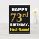 Denna enkla födelsedag-themed hälsningkortdesign presenterar en varm födelsedagwishnågot liknande "den 73rd FÖDELSEDAGEN för LYCKLIG, förnamn!", på bekläda i djärv text på en svart kulör bakgrund. Födelsedagen numrerar har faux-/efterföljdguld-något liknande färga som är utseendemässigt. Namn på bekläda kan skräddarsy. Insidan presenterar ett födelsedagmeddelande som kan vara personligen. En något liknande för hälsningkort detta kunde vara en roligt långt som levererar födelsedagönskemål till någon som firar deras tredje födelsedag för sjuttio. [~Z0000275]