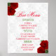 Djup röd ros Blommig meny för bröllopsbaren. Matchande produkter tillgängliga. 100% Anpassningsbar. Klar att fylla i rutan/rutorna eller Klicka på knappen ANPASSA för att lägga till, flytta, ta bort, ändra storlek eller ändra någon av teckensnitten eller grafiken. Tillverkad med högupplösta vektorer och/eller digital grafik för professionell utskrift. OBS: (DETTA ÄR EN UTSKRIFT. Alla Zazzle-produktdesign är "utskrifter" om inte annat anges under "Om denna produkt"-området) Designen kommer att skrivas ut EXAKT som du ser den på skärmen och på produkten... så se till att när du gör dina ändringar av storleken på någon av grafik eller text passar in i områdena korrekt och att din stavning och formulering är som du vill ha den i storlek, färg och teckensnitt. Om du har några frågor om denna design, vänligen kontakta mig på siggyscott@comcast.net eller besök min butikslänk: http://
