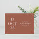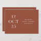 Meddela er bröllopsdatum med varm säsongsstil med hjälp av detta minimalistiska "Save the Date"-kort med en rik djup terrakotta bakgrund (även känd som roströd lera). Den djärva, redaktionella datumlayouten ger en modern, designmässig känsla, medan baksidan har plats för ett favoritfoto för en personlig touch. Den varma jordnära tonen gör denna design perfekt för höst- och sensommarbröllop, boho-firanden, vingårdsevenemang eller utomhus-samlingar med naturliga texturer och mysiga färgpaletter. Anpassa datum, namn, plats och foto för att passa din stil. Finns tillgängligt både som tryckt kort och digital nedladdning.
