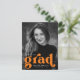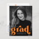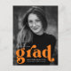 Djärva examensfestinbjudningskort med den examinerades vertikala foto med "grad" i fet orange bokstav. Anpassa fotots examensfestinbjudningar genom att lägga till den examinerades namn, examensår och skola. Baksidan av examensfestinbjudan visar din returadress och festdetaljer.
