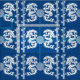 Ursnyggt tyg med asiatiska motiv. Linjer av bambu avskiljer det huvudsakliga mönster av drakar och en kinesisk medaljong. I indigoblå blått och vit.