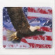 Ett beautifully patriotiskt avbildar av en amerikanörnfågel som soaring över snö täckte berg, på en vinka amerikanska flaggan som gränsas med djupfryst snö och is. Det djupfryst flaggafotoet togs av den observant kor-synade fotografen, rånar Boyer.