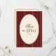 Meddela din fest i tidlös stil med detta Vintage Deep Burgundy-ränder Gamla Pengar Bröllop Spara Datum med QR-kod. Designad med en sofistikerad, tyst lyxig tunnrandig bakgrund. Elegant och romantisk layout blandar klassiska gamla pengar-estetik med en ren, minimalistisk design. De djupa röda, vinröda, burgunderröda och vintage elfenbenstonerna skapar en sofistikerad palett som påminner om vintage lyx, medan den raffinerade script kalligrafin lägger till en polerad, överdådig finish.