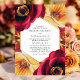Denna djärva och eleganta bröllopsinbjudan har livfulla röda och gula blommor som ramar in en modern gyllene geometrisk hexagon. Den rena, off-vita bakgrunden inom ramen framhäver det slående blommiga mönstret, vilket gör det perfekt för par som vill kombinera klassisk elegans med en modern twist. Denna inbjudan sätter en sofistikerad ton för ett bröllop fullt av stil och personlighet.