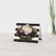 Det här eleganta tackkortet för bröllopsfesten matchar inbjudningskollektionen för bröllopsfesten som visas nedan och har ett mönster med breda horisontella ränder i svart och elfenben med en dekorativ svart textruta i form av en klammer med två yttre kanter i guld. Orden "Tack" är tryckta med en simulerad guldstruktur. Det finns en färgrik blomsterbukett högst upp i mitten och längst ner till höger om textområdet med vackra rosor i kräm, elfenben och rosa, med orange peruanska liljor och grönt bladverk. Insidan av kortet är elfenbensfärgad och har små övre och nedre ramar i svart med ränder av simulerat guld tvärs över kortets bredd. Du kan anpassa tackmeddelandet för att lägga till din egen vers eller annan text