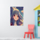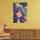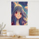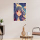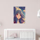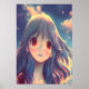 Animerad flicka med långt blått hår och stjärnor och moln på himlar i bakgrunden. Det här är en AI-skapad konst.