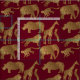 Silhouettedjungeldjur verkar nästan för att glöda på den mörka burgundy bakgrunden av detta tyg! De djura silhouettesna inkluderar en elefant, en giraff, ett lejont, en noshörning, en papegoja och en apa. Varje silhouette fylls med bruna sebratyprandar som är rinnande till och med ljust guld. Unikt och attraktivt!