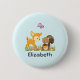 Knappen personlig med en söt illustration som visar en hjort i baby och en liten ekorre som håller en akorn och en fjäril som flyger ovanför deras huvuden. De här vackra skogslandarna som står på lite gräs med lite viskaktig svamp vid fötterna. Ljusblå bakgrund.