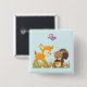 Knapp med en söt illustration med en baby hjort och en liten ekorre som håller en akorn och en fjäril som flyger ovanför deras huvuden. De här vackra skogslandarna som står på lite gräs med lite viskaktig svamp vid fötterna. Ljusblå bakgrund.
