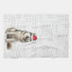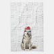 Här är en roligt helgdag kökshandduk eller åkerhandduk. Ett vackert vattenfärgstryck på en söt Alaska Malamute Santa hund som sitter med roligten "woof" ord art-bakgrund. Hund bär en julhatt.