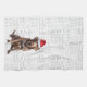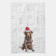 Här är en roligt helgdag kökshandduk eller åkerhandduk. Ett bra exempel på en choklad Labrador Retriever-hund som sitter med roligten "woof" ord art-bakgrund. Hund bär en julhatt.