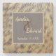 Denna underlägg har ett djurtryck foto av honanka fjädrar. De vackra guld- och mörkbruna fläckiga fjädrarna böjer och flyter vertikalt på detta underlägg. En solid tan- och grå fyrkant i mitten ger bakgrunden för brudens och brudgummens namn och bröllopsdatum.