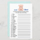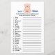 "Namngivningsspel för djurungar"-bladet är en förtjusande baby shower-aktivitet där gästerna kan visa upp sin kunskap om djurriket. Den innehåller en lista med 20 djur, och deltagarna måste skriva ner termen för varje djurs unge. Överst sätter en söt bild av en teddybjörn tonen för den barnvänliga tematiken. Det här spelet är inte bara en rolig utmaning för djurälskare, utan också en söt hälsning till den hedrade gästens lilla på väg. Det är en perfekt isbrytare och ett bra sätt att lägga till lite utbildningssyfte och kul till en baby shower-firande för en babypojke.