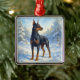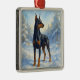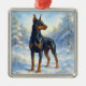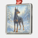 En elegant Doberman Pinscher står stolt i en snöskog, dess varningsställning och slående markeringar som på ett vackert sätt motverkar det serene vinterlandskapet.