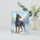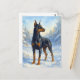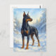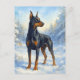 En elegant Doberman Pinscher står stolt i en snöskog, dess varningsställning och slående markeringar som på ett vackert sätt motverkar det serene vinterlandskapet.