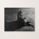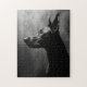 En svart Doberman Pinscher står i profil mot en mörk, rökig bakgrund. Hund huvud lutas något uppåt, dess stora öron gick framåt och dess blickar riktas mot något utanför kameran. Bilden är i svart och vitt och skapar en dramatisk och mystisk atmosfär. Röket ger en känsla av djup och irritation, medan hund silhuett tydligt står emot den dunkla bakgrunden.