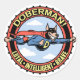 Tecknad toppen hjälte "Doberman!" logotyp, med Doberman som flyger och "Doberman - Loyal, Intelligent, Modig" i ett runt emblem. Roligt, roligt, t-shirts, kort, gåvor.