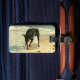 Digital målning av en härlig DobermanPinscher som frolicking på stranden som havvågar, tvättar upp på kusten och lämnatass avtryck i sanden.