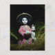 AI-genererad vacker docka som går längs en mossig skogsväg med ett kattkanin-hybriddjur