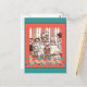 Söt vintageillustration huvudsakligen i rött av en liten flicka som har en tebjudning med sina dockor.