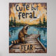 Den här charmerande målningen har en tvättbjörn med flytande brun och vit päls och ett nyfiket uttryck som står på en rustisk träbåt. Rakkonet tittar ut över en lugn sjö, som återspeglar omgivande skog och ett färgstarkt himmel. Texten "Cute but feral" visas djärvt i ett stiliserat teckensnitt högst upp och grund i teckningen. Konsten har en tjockt, texturerad impasto stil, ge en levande och livfull känsla.