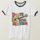 En humoristisk och öga-fångstande dödsformad t-shirt med metall, med en karikatyr av ett huvudskelett med en elektrisk gitarr. Guitarren har överdimensionerade dimensioner och avger gnistor medan en trumuppsättning exploderar i bakgrunden. Texten "Död Metall Mayhem" står skriven i fetstilt brev med flera färgader, med varje ord i ett annat typsnitt, ge det en lekfull och energisk känsla. Den övergripande utformningen är livfull och underhållande, perfekt för en t-shirt som fångar dödsandan metall utan att ta sig för allvarligt. 💀 👕