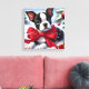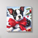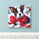 En söt Boston Terrier-marionett med en röd buske under snöfall bredvid helgdag