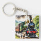 A nostalgic scene of a dog greeting the arrival of a green steam train.