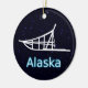En enkel vit silhuett av en hund som säljs på en stjärnbakgrund. Texten "Alaska" visas i blått och vitt.