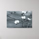 Ett närliggande foto fångar den känsliga skönheten hos blommar av dogmatiskt trä i en monokrom palett. Fyra vita blommor med framstående gulter blommar på ett snyggt sätt på slender grenar, deras blad rullar upp mot en mjuk, suddig bakgrund. Grenar, med små löv i spetsen, skapar ett känsligt nätverk mot den muterade gråttet-bakgrunden, vilket ger en känsla av lugn och naturlig elegans.
