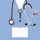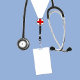 Läkarskolans presentbyte i studenten och doktor party dekoration med blå sjukhusskrubbar, stetoskop och lustigt schweiziskt armés knivar. Redigera text om du vill lägga till läkarens namn.