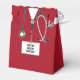 Kreativa presentförpackningar för läkarfest med röda sjukhusskjortor och ett stetoskop. Redigera texten för att enkelt anpassa.