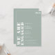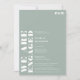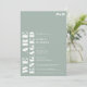Fet, enkel vit dammig grönt bröllop-förlovningsfest med "vi är engagerade" skriven med ett överdimensionerat fet teckensnitt i vitt