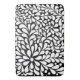 Blommor och snurrande vita petaler mot en fet svart bakgrund. Originalfärgning av digitalt material. Crisp kant, vassa linjer och vita prickar och snurrande petaler.