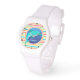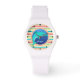 Coola, söta ungar hav, havstid, temadesign med tecknad akvariedelfin på färgstarkt rött, orange, gult, grönt, blått, vitt regnbåge i rand mönster.