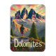 En fängslande och nostalgisk skildring av vandringen i Dolomiterna, Italien, som visar upp bergsområdets hårda skönhet och dramatiska landskap. Utformningen har hökare som färdas genom sceniska spår mitt i boskapstoppar, lush-ängar och alpina sjöar. I en vintage stil ger teckningen upphov till äventyrliga och goda erfarenheter av att utforska Dolomiterna och uppmanar tittarna att slå sig ned i sin naturliga fantastiska fantasi