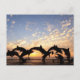 Ett vackert foto av en delfinstaty som kommer från yta i ett fontän framför en vacker bild av sol med hemska röda moln. En resebild för perfekten för att göra en händelse ljusare