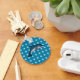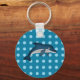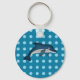 Den här nyckelkedjan visar en delfin. Delfinen ligger ovanpå en blå bakgrund med ljusblå polka dots.