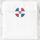 Dominikanska republikens flagga. Dominikanska republikens flagga har ett centrerat vitt kor som sträcker sig till kant och delar upp flagga i fyra rektanglar - de översta är blå (på den blå sidan) och röd, och de grund är röda (på den blåa sidan) och blå. En stor jackat av arm som har en sköld med flagga-utformning och som stöds av ett lager gren (lämnat) och en handflatan-frond (höger) är i mitten av kor. Ovanför skölden finns ett blått band som visningar det nationella mottot: Dios, Patria, Libertad (Gud, Fatherland, Liberty). Under skölden visas ord República Dominicana på ett rött band. I mitten av skölden, som är täckt av tre spjut (två av dem som håller Dominikanska banderoller) på vardera sidan, är en bibel med en liten kor ovanför den och som sägs vara öppen för Gospelet John, antingen för kapitel ett eller kapitel 8, punkt 32, som lyder Y la verdad nos hará libre (och sanningen ska göra dig fri).
