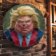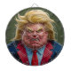 En cirkelformad rityta med en karikatyr av en man med blondinskt hår och ett uttryck för arg. Ansikte fyller hela styrelsen och hans ögon är vid med grönt elever. Han bär kostym och slips och munnen är öppen i en cell. Bild i Donald Trump Dart Board. En rund rityta med en karikatyr av Donald Trump. Bilden är ett humoristiskt upptag av politik, som passar vuxnor och de som tycker om bra skrattar.