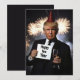 Donald Trump tar in nyåret med en festlig hatt, ett glas champagne och en djärv ”Happy New Year”-skylt. De livfulla fyrverkerierna i bakgrunden förstärker den festliga stämningen.