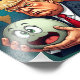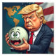 Tecknad illustration av Donald Trump som håller ett boll med en arg ansikte med den amerikanska världen bakom sig.