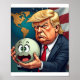 Tecknad illustration av Donald Trump som håller ett boll med en arg ansikte med den amerikanska världen bakom sig.